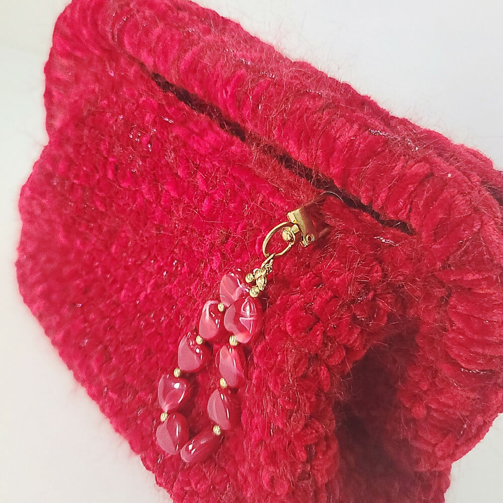 Playful meets chic: burgundy mini clutch in fuzzy and glittery yarn, with a delicate heart charm for a touch of whimsy.🌟 One of a kind.