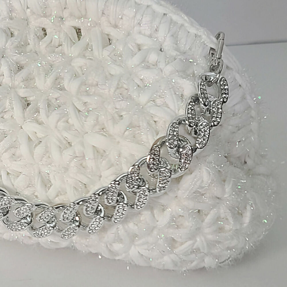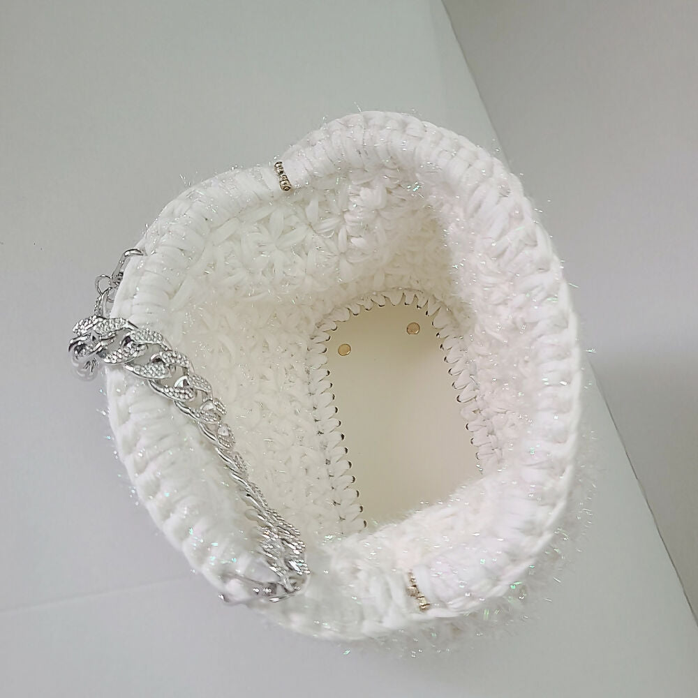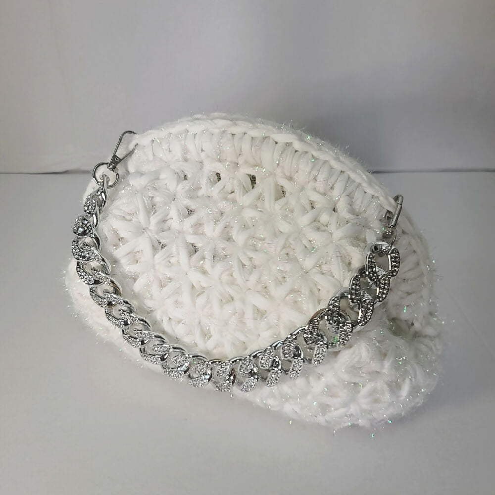 Delicately crafted with glass yarn for a subtle shimmer, featuring a snowflake motif and an embellished chain handle. Elegant and unique — perfect for special occasions.🌟 One of a kind