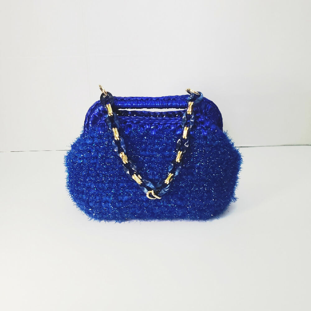 Handcrafted with premium textured yarn and finished with a bold gold-and-blue chain. A unique statement piece that’s perfect for day or night.🌟 One of a kind