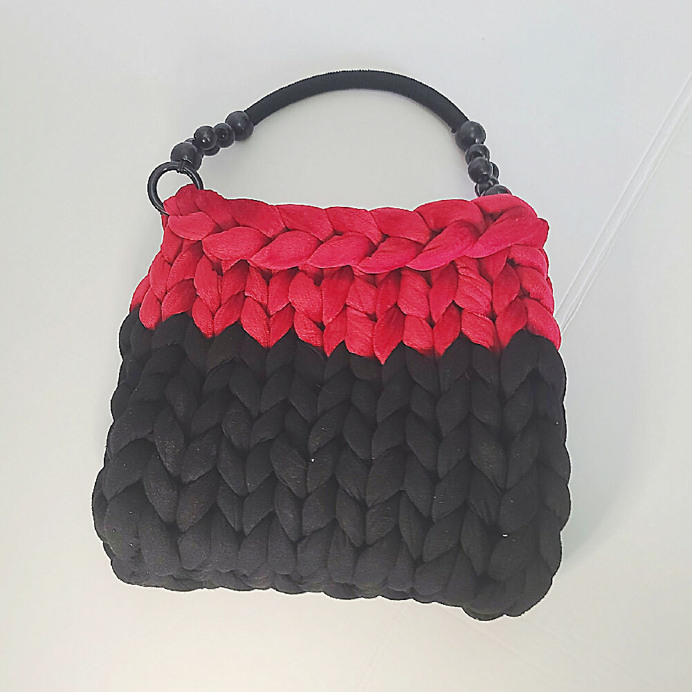 Statement style: black and burgundy chunky bag with a handcrafted woven handle and playful wooden bead details.🌟 One of a kind