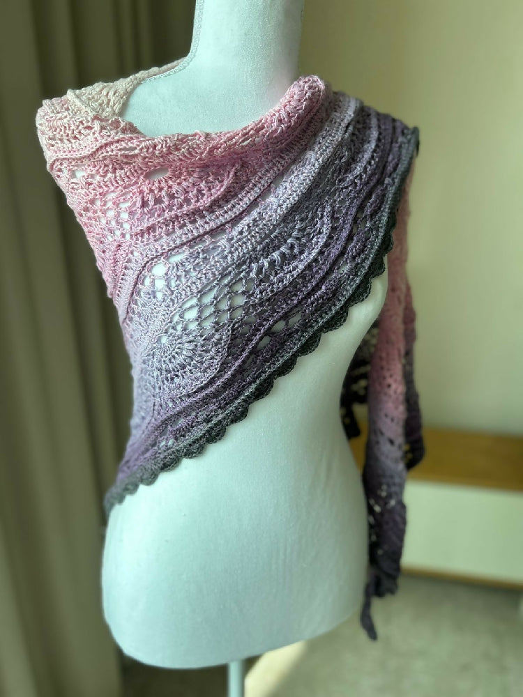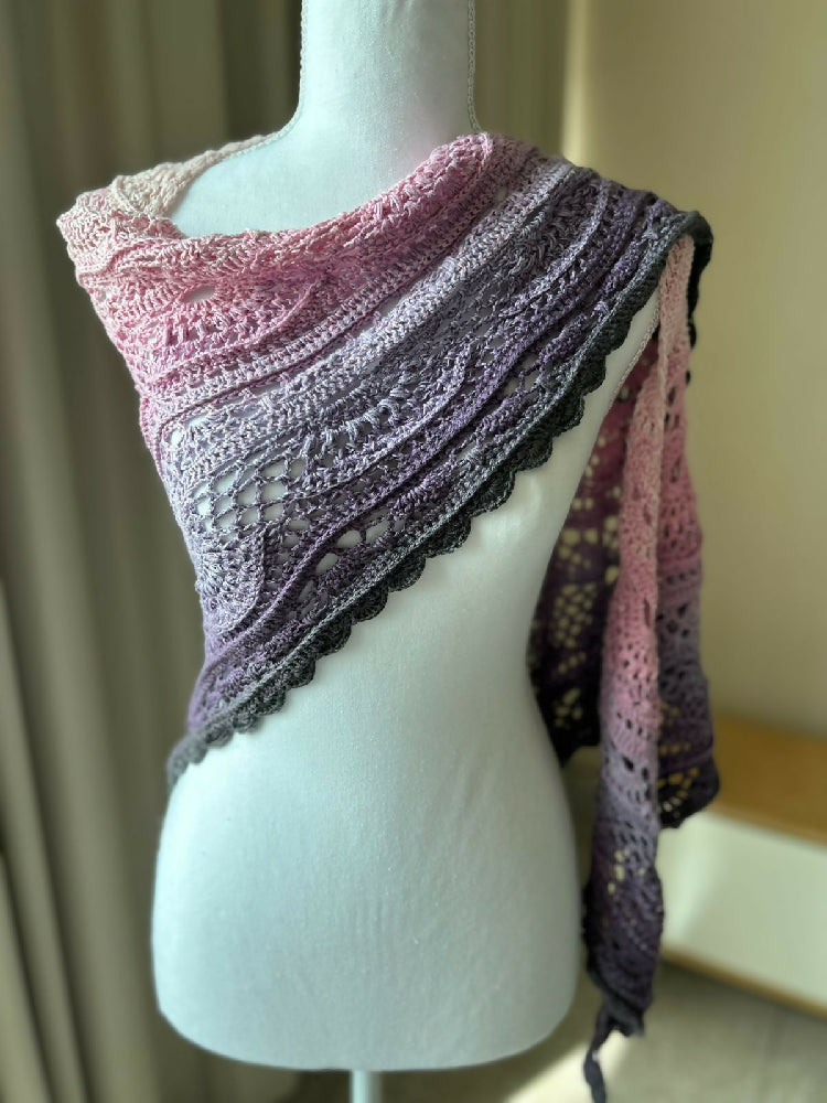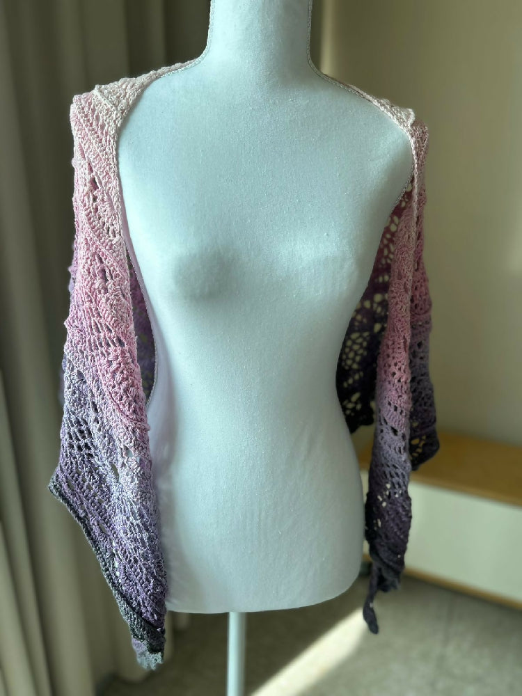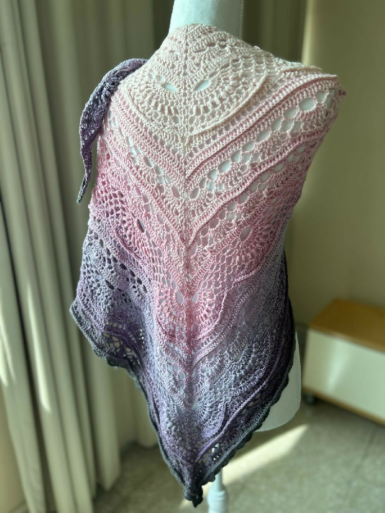 Wrap yourself in artistry and comfort with the DarjeelingTea Shawl. Carefully crafted with intricate stitches and a harmonious colorway of baby pink, lilac, purple, and grey.