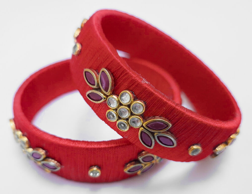 Two piece red silk thread bangle set with clear and red Kundan stones.