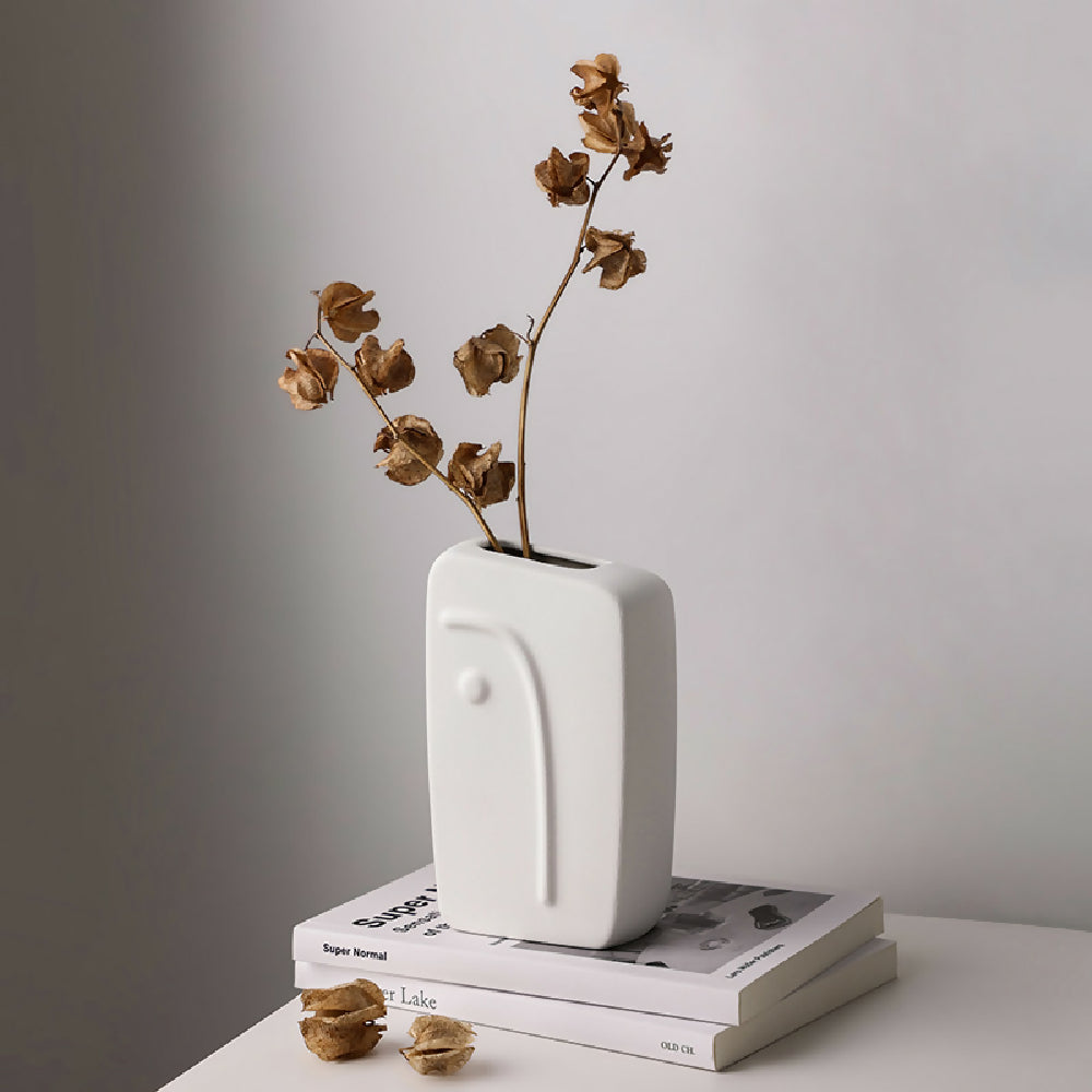 Subtle yet expressive, this matte white vase features a gentle abstract face impression. Compact and modern, it’s perfect for minimalist corners, desk tops, or bedside styling. A true blend of art and function.