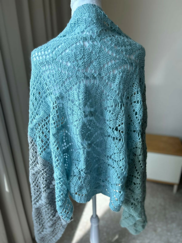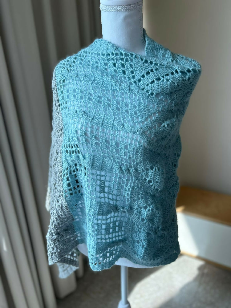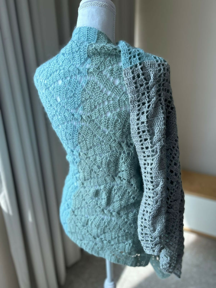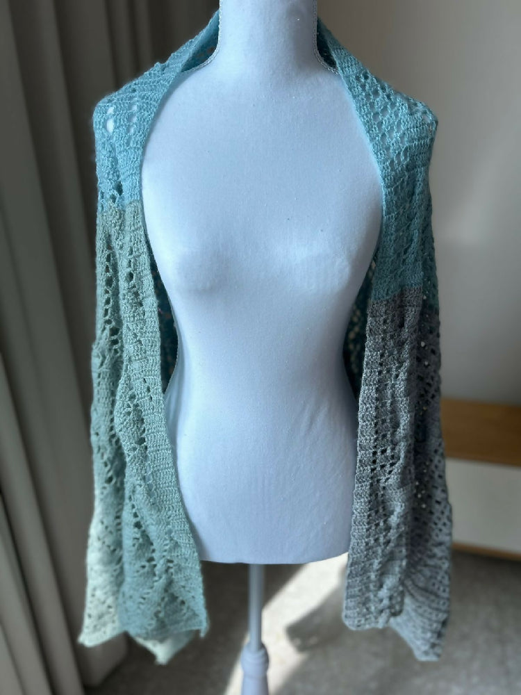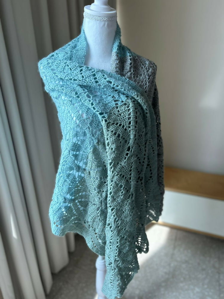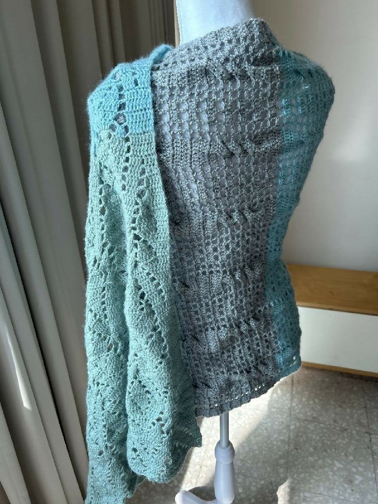 Wrap yourself in cozy sophistication with this handmade crochet rectangular shawl. Carefully crafted with intricate stitches and soft drape, this versatile piece adds warmth and elegance to any outfit. Its generous size allows for versatile styling—whether you fold it, wrap it, or layer it, each arrangement highlights the intricate stitch patterns and subtle textures that make this piece unique. The colorway is made up of a muted jade green, a muted blue and grey.