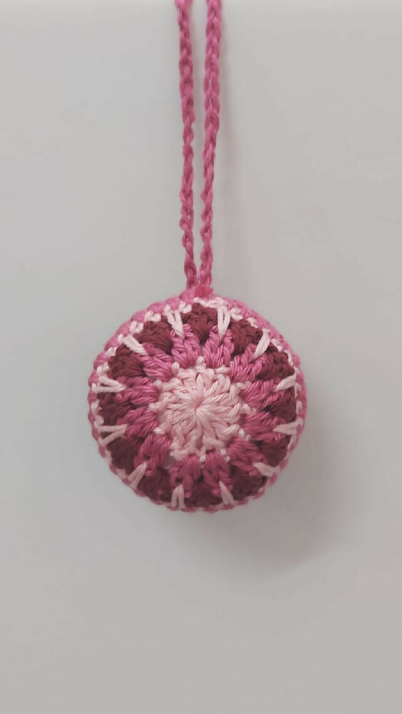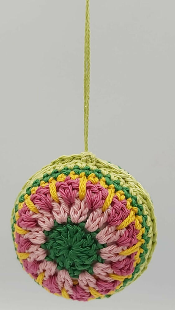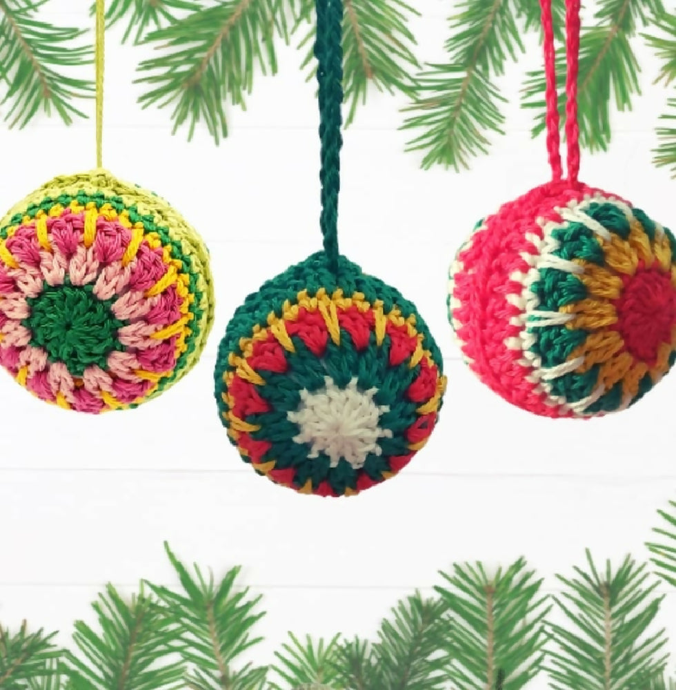 These handmade crochet baubles are made with 100% cotton yarn and filled with a Styrofoam ball.
