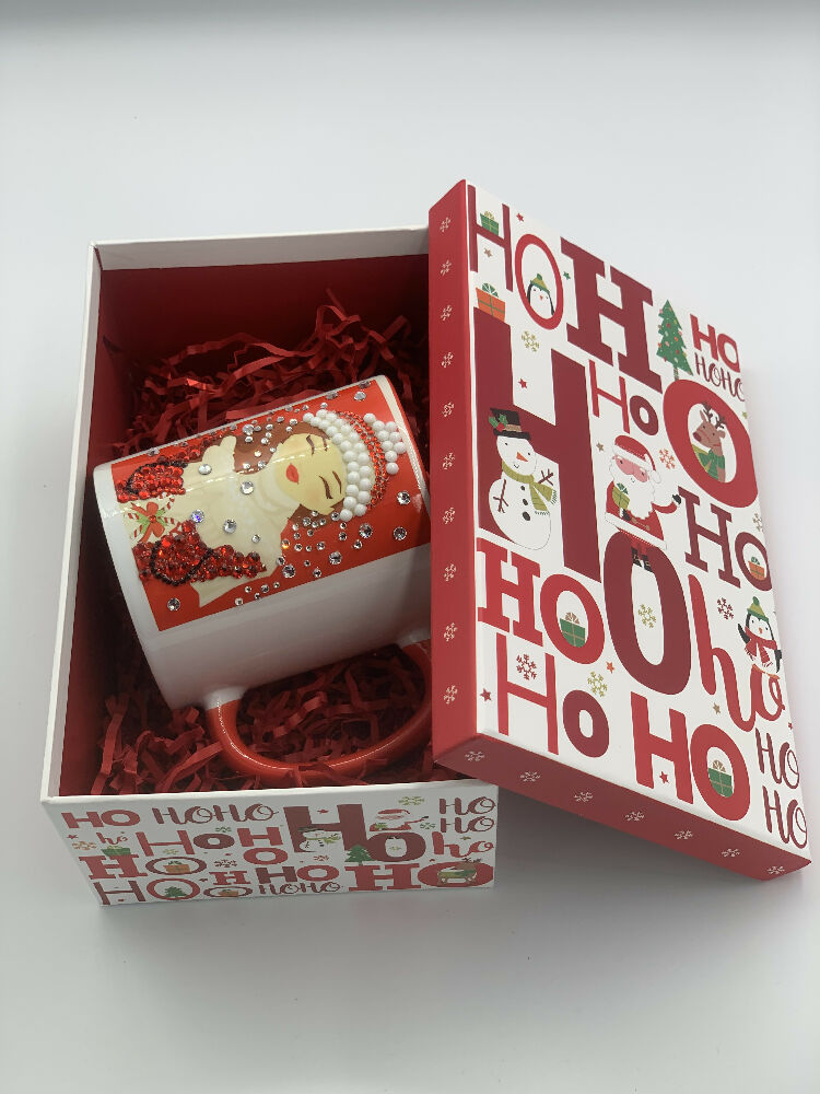 Printed Christmas mug designed with red, white, black and clear rhinestones from both sides.
