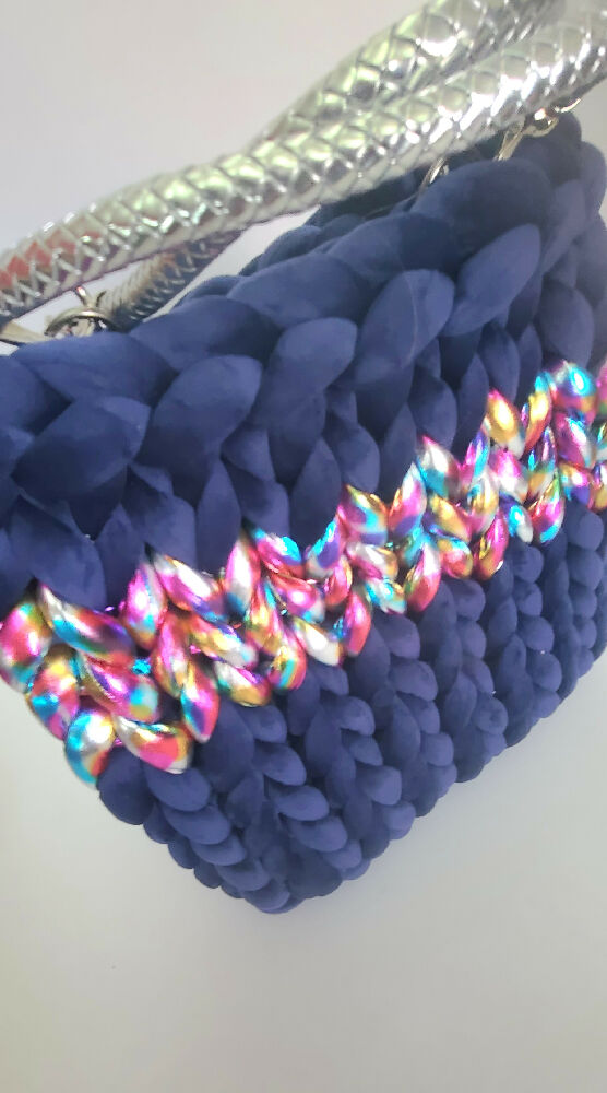 Velvet tote, made in chunky yarn with and insert of metallic yarn. Silver handles.