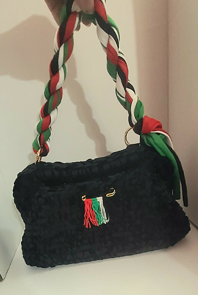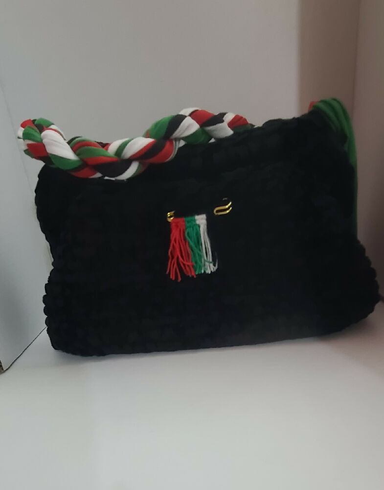 This clutch keeps UAE in the heart. Detachable handle. Pin decor in UAE colors. Made in black t-shirt yarn and chenille yarn.