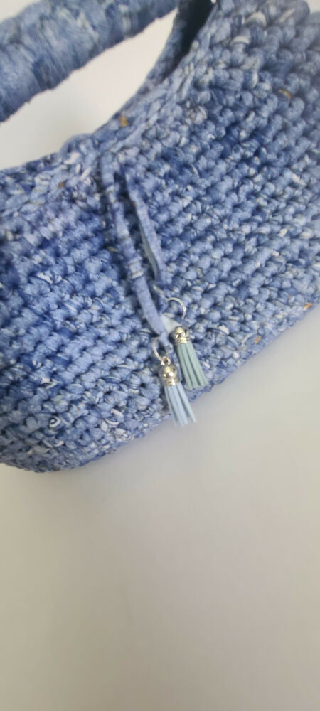 Maxi clutch, made in denim aspect t-shirt yarn. Features a playful fringe and a secure snap closure.