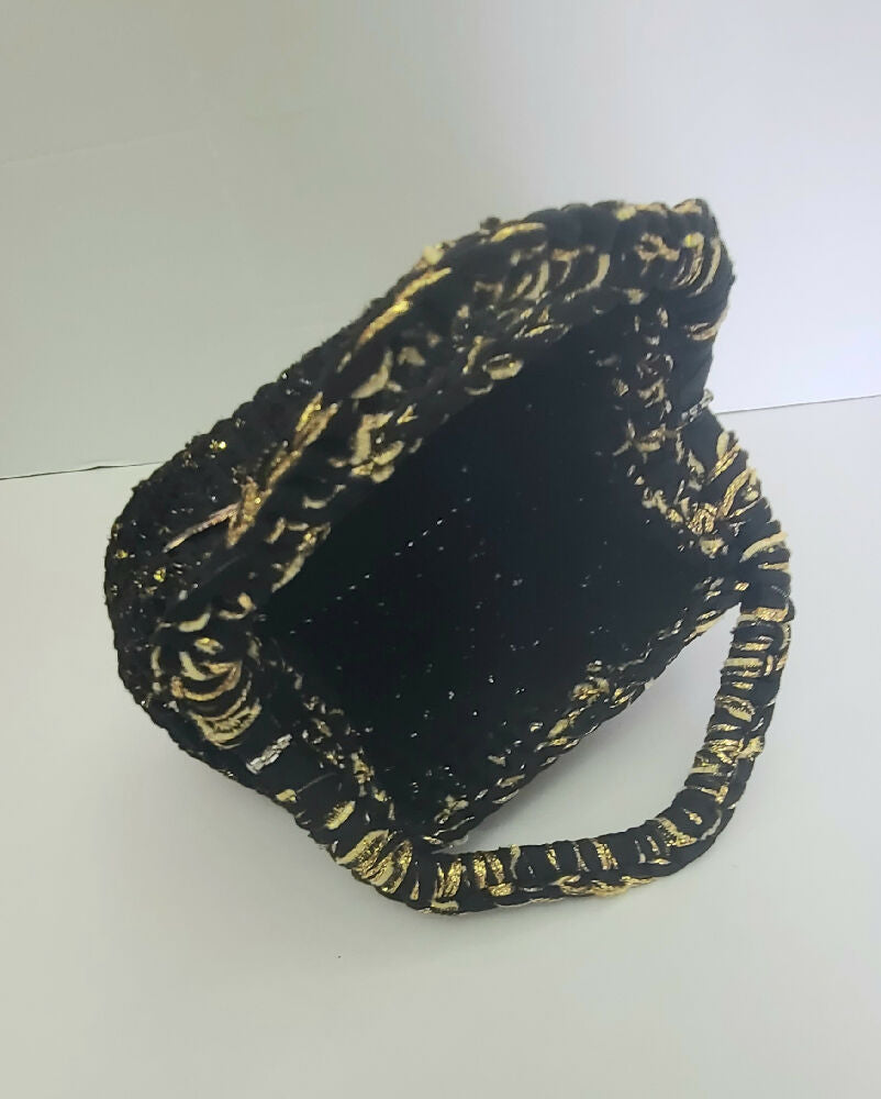 Midnight glitter clutch,  made in t-shirt yar with accented gold sequin yarn. A small charm adds an elegant touch.