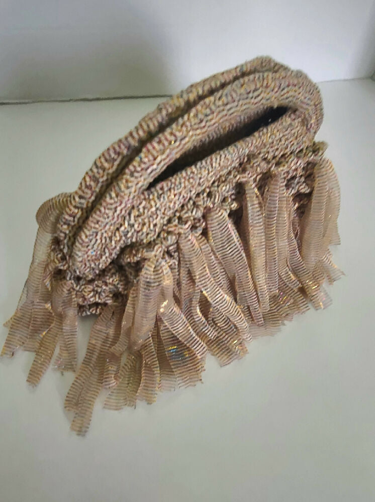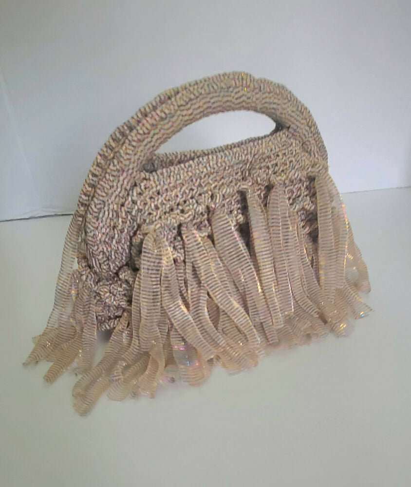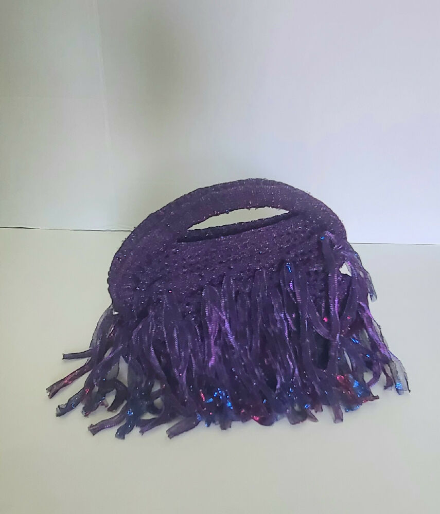 Made in shimmering organza clutch, features a round snap handle, and flowy fringes.