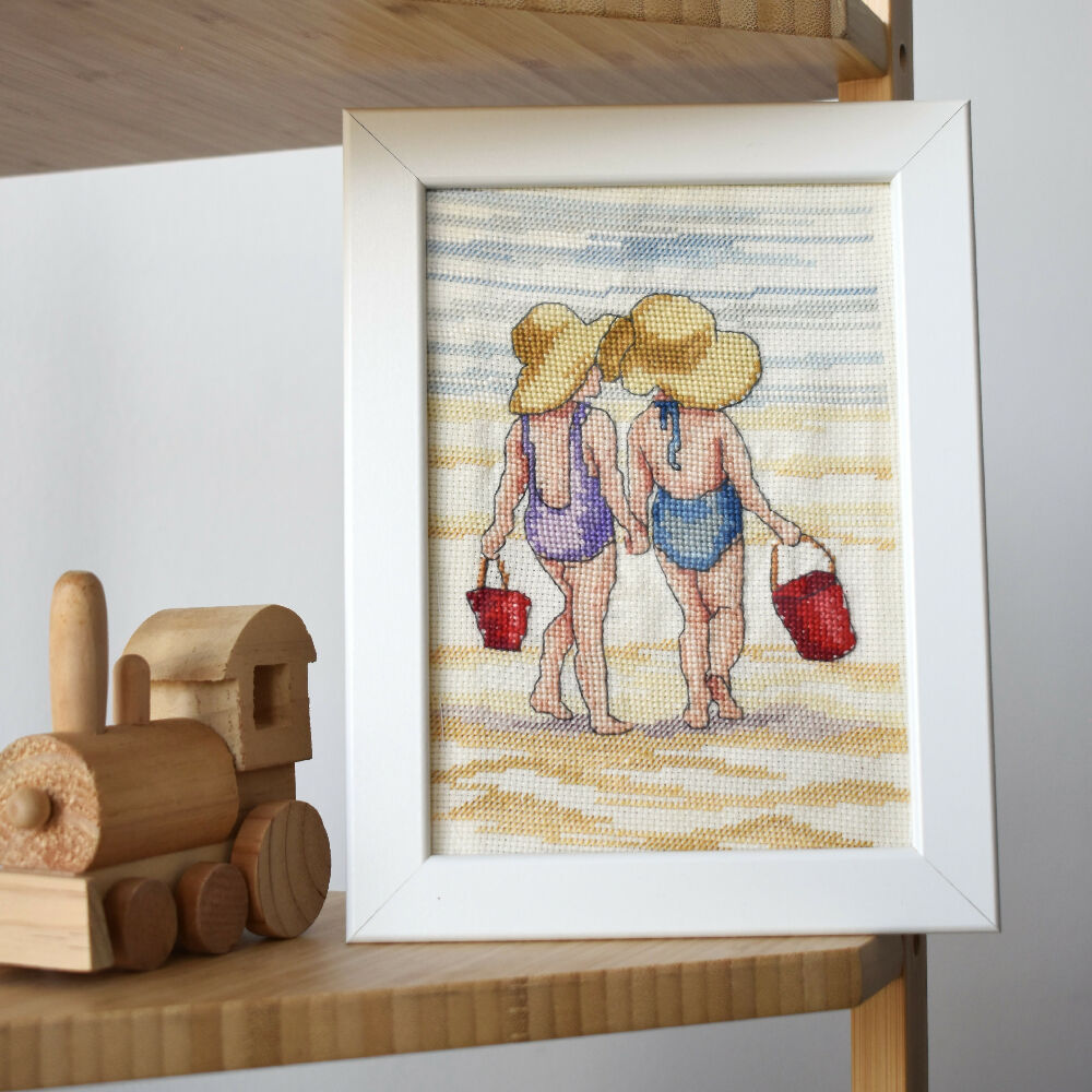 This framed cross stitch shows what we all wish we were doing: strolling on the beach with a friend, a big hat and a red bucket for collecting seashells.
