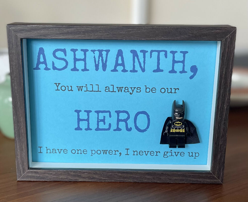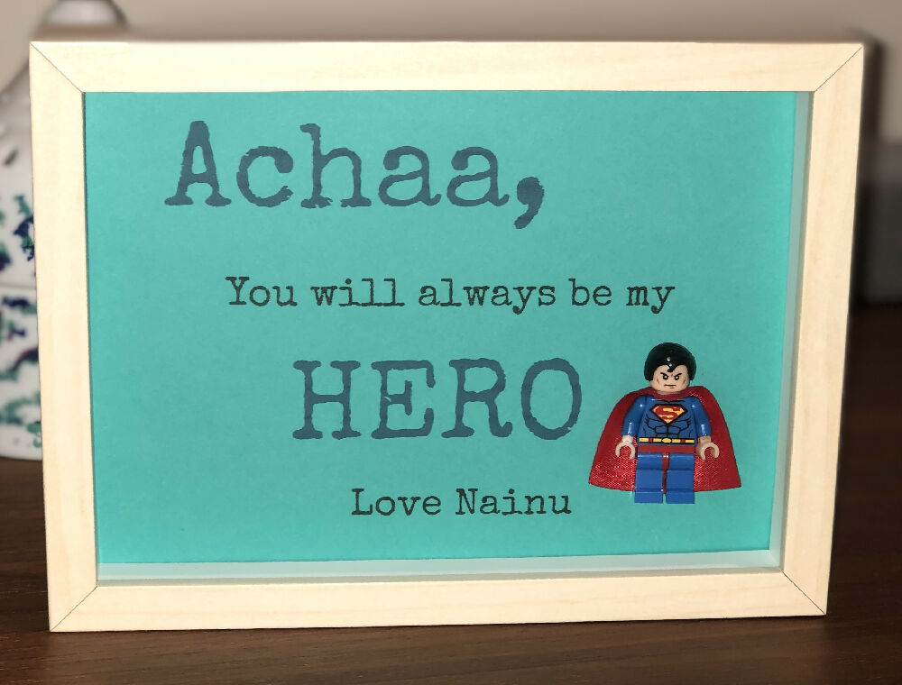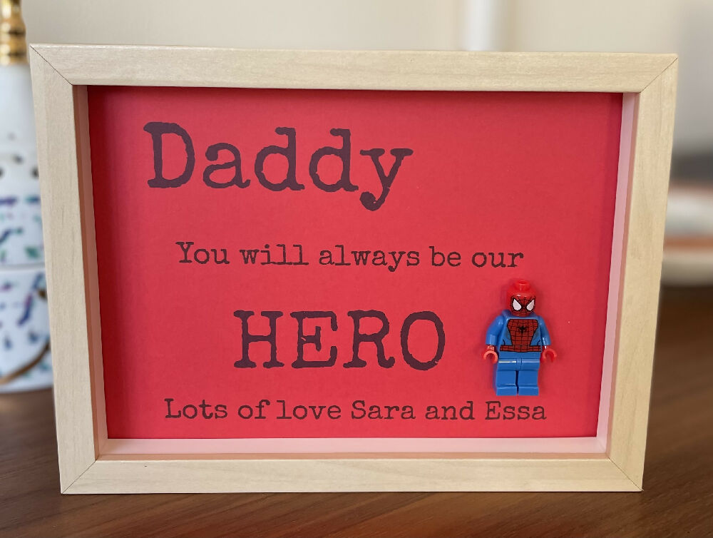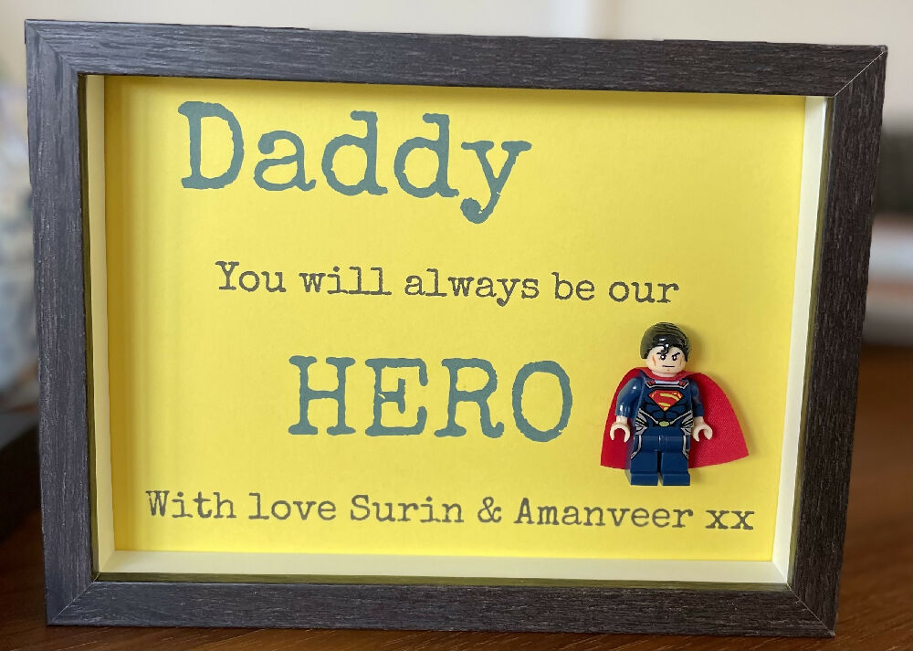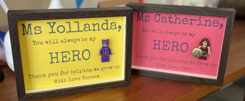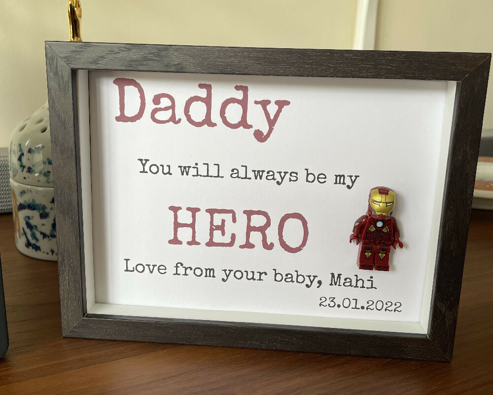 Celebrate the hero in your life by choosing this I frame. Personalise your frame by selecting the background colour (yellow, pink, teal, blue, white), superhero minifigure and text.