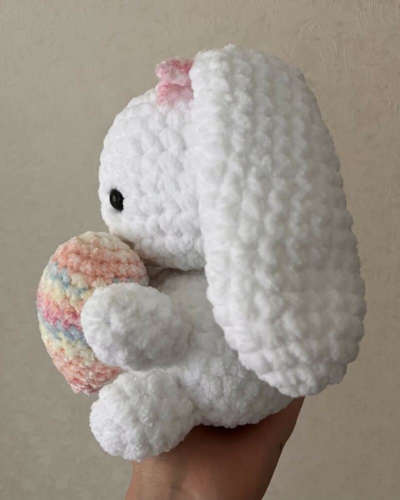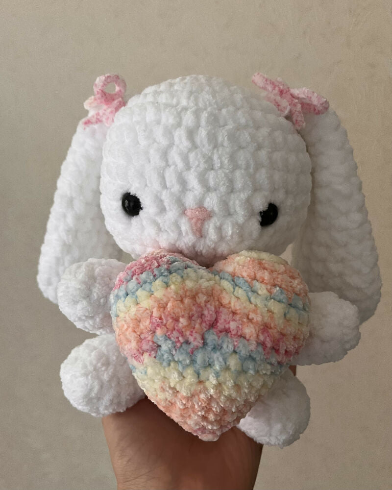This adorable, hand-crocheted bunny is overflowing with affection! Made with soft, plush white yarn and featuring cute pink bows on its ears, it lovingly holds a unique, multi-toned striped heart.
